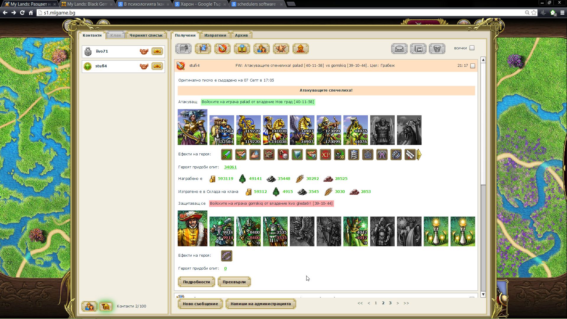 Маниак,защо не дадеш някой скрийн на битките на барселино или твоите с 999gh?И защо не кажеш колко време ти бях дал да се развиваш с обещание да не те закачам?Нещо някога да съм излъгал?Същото важи и за Радо...видяхте една бележка и умряхте от страх...това,че наставника ти от каталунския катун е шубе и избяга отпуска чак,не прави бележката кой знае колко страшна...и не забравяйте,че почти половината армия винаги може да си я вдигнете,да не давам примери на хора,които съм бил или са се разбивали дори къде са в класирането...също и такива като Ахил,които доста по-късно започнаха да играят...ама не,трябва да мрънкаме...аз в началото на играта имах 5-6 играчи в моята територия ,от един клан при това,с много по-големи армии от моята,но се оправих,нали?В заключение-доста хора са го казали,но ще го направя и аз-играта е с предостатъчно методи за защита(ако питате мен даже са в повечко